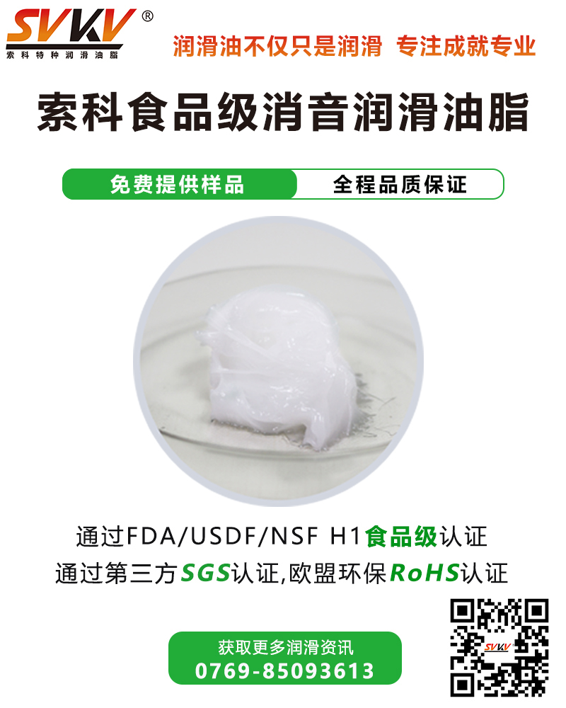 索科SVKV食品級消音潤滑油脂,選用食品級基礎油和無毒無害的添加劑精制而成,專為食品醫療設備所研制。索科SVKV食品級消音潤滑油脂符合美國FDA和USDA法規標準,并通過USDA/NSF-1食品級認證,保障設備產品的衛生安全。