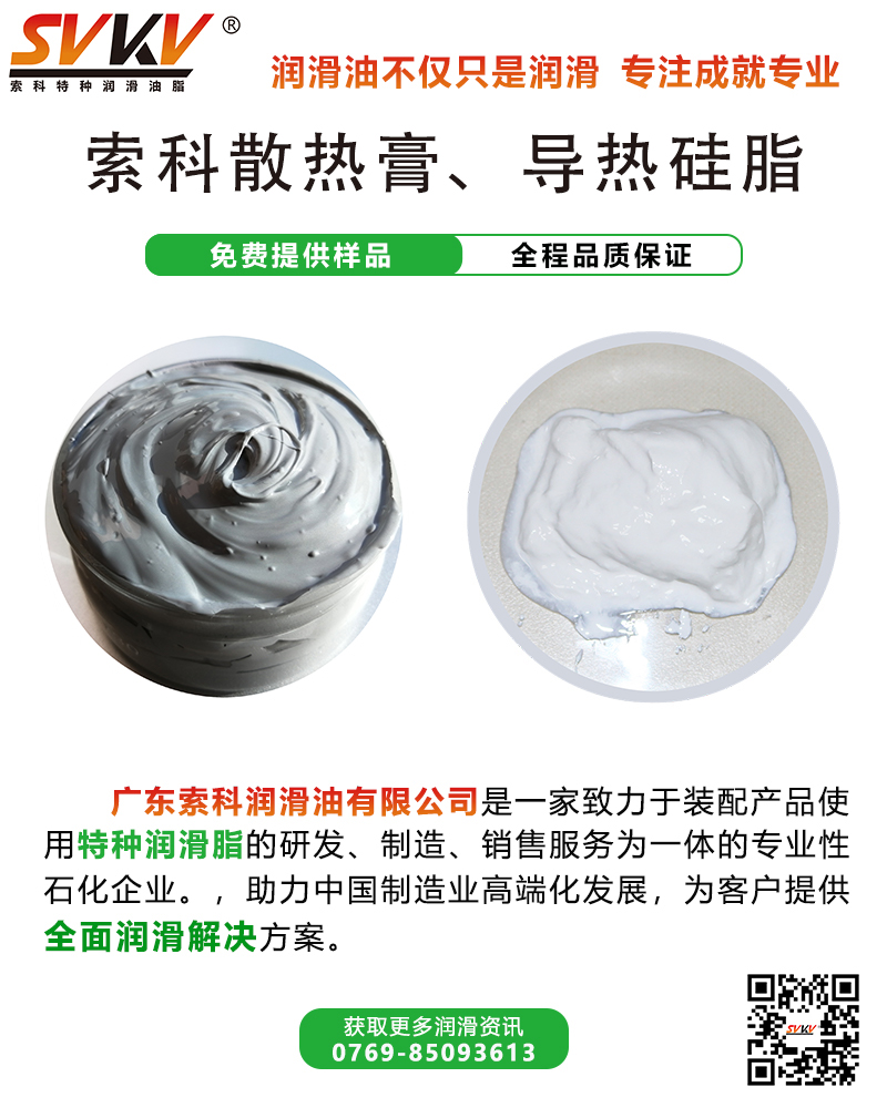 SVKV索科系列導熱硅脂以聚硅氧烷為基礎輔以高導熱填料精制而成,安全環保,性能穩定,既具有優異的電絕緣性,又具有優異的導熱性,揮發性小,可薄膜涂覆。