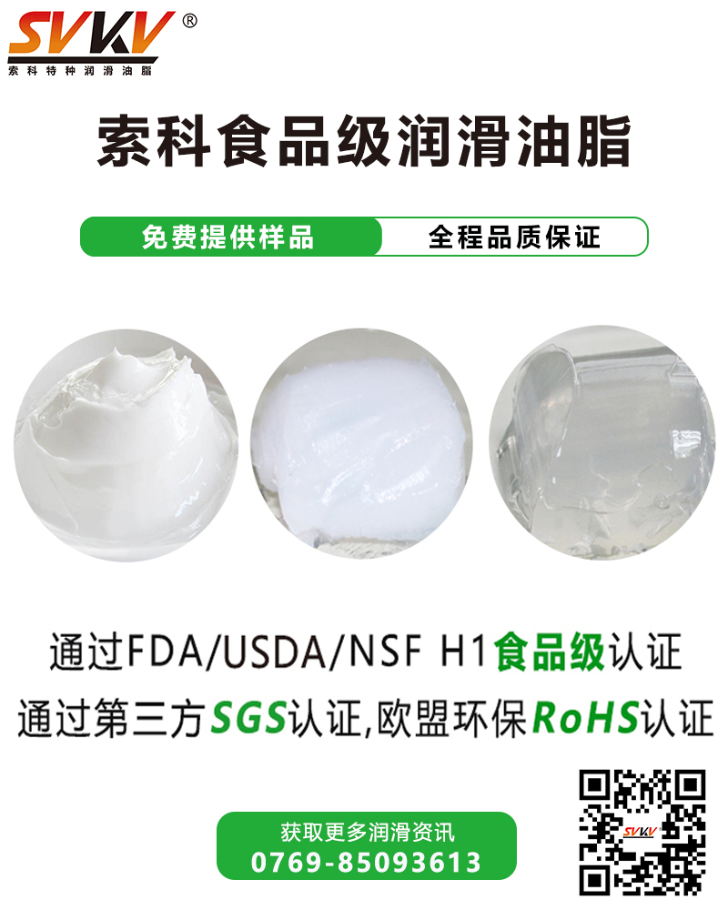 索科SVKV系列食品級潤滑油脂還通過美國FDA、USDA/NSF—H1食品級安全認證,無毒無害,安全衛(wèi)生有保障。