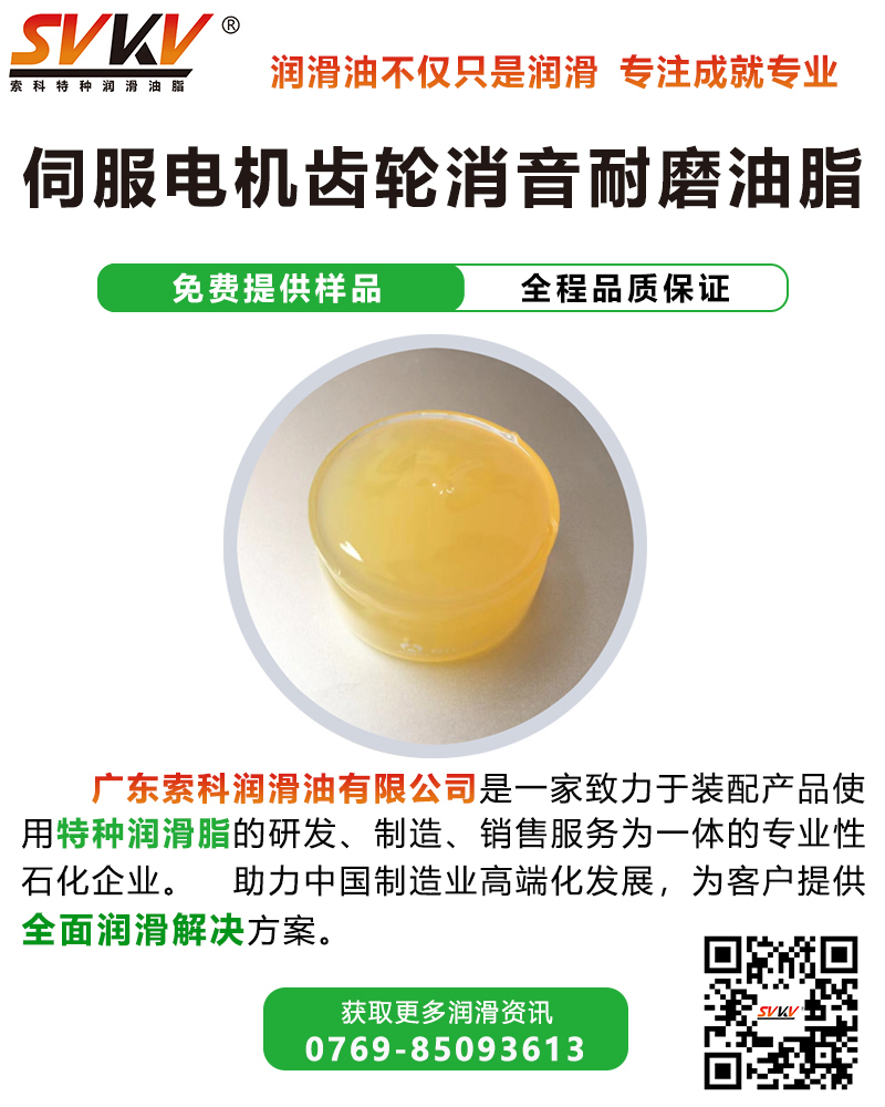 索科SVKV伺服電機(jī)齒輪消音耐磨油脂選用高性能基礎(chǔ)油,并添加多種高效抗氧化、抗腐蝕添加劑精制而成,是專為伺服電機(jī)齒輪消音耐磨潤滑所研發(fā)的潤滑油脂。索科SVKV伺服電機(jī)齒輪潤滑油脂能有效減少伺服電機(jī)齒輪磨損,降低噪音,延長齒輪使用壽命。