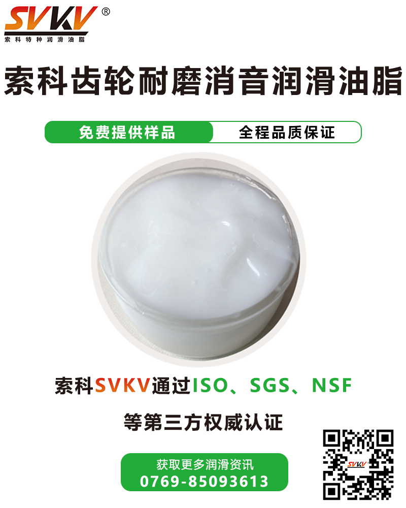 廣東索科潤滑油有限公司是一家致力于裝配產品使用特種潤滑脂的研發、生產、定制、服務為一體的專業性石化企業。致力為制造業客戶,提供專業的選油方案,協助客戶解決產品裝配時的潤滑難題,還可根據客戶特殊需求訂做適合的潤滑油品。有效提高產品性能、減低維護成本,索科助力制造業高端化發展! 主要產品有: 齒輪消音潤滑脂|高溫潤滑脂|食品級潤滑脂|齒輪消音潤滑脂|防水潤滑脂 導電油脂|軸承油|硅油|干性皮膜潤滑劑|低溫潤滑脂|阻尼脂|全氟油脂