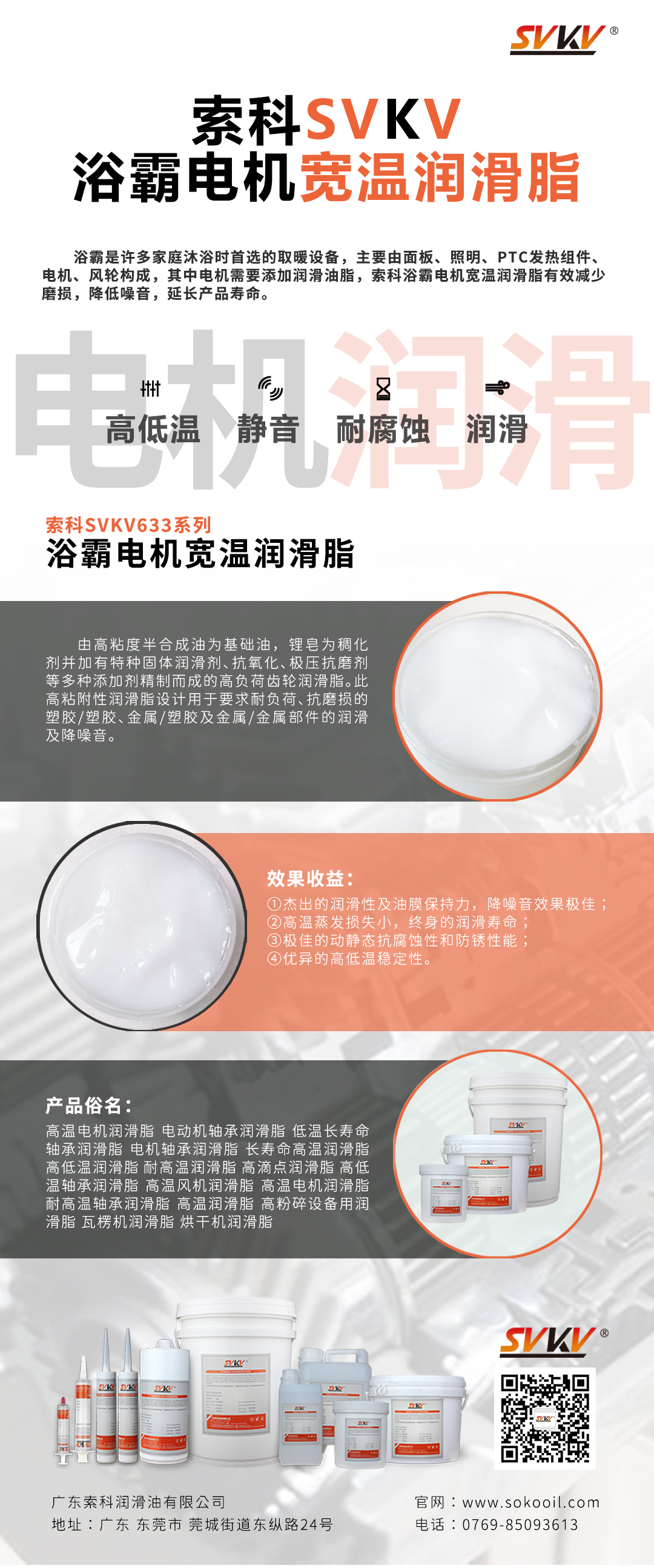 索科為企業提供潤滑方案,降本增效,適合的潤滑脂能有效減少磨損,降低噪音,延長產品壽命。索科提供浴霸電機寬溫潤滑脂0769-85093613免費樣品,全程品質保證!